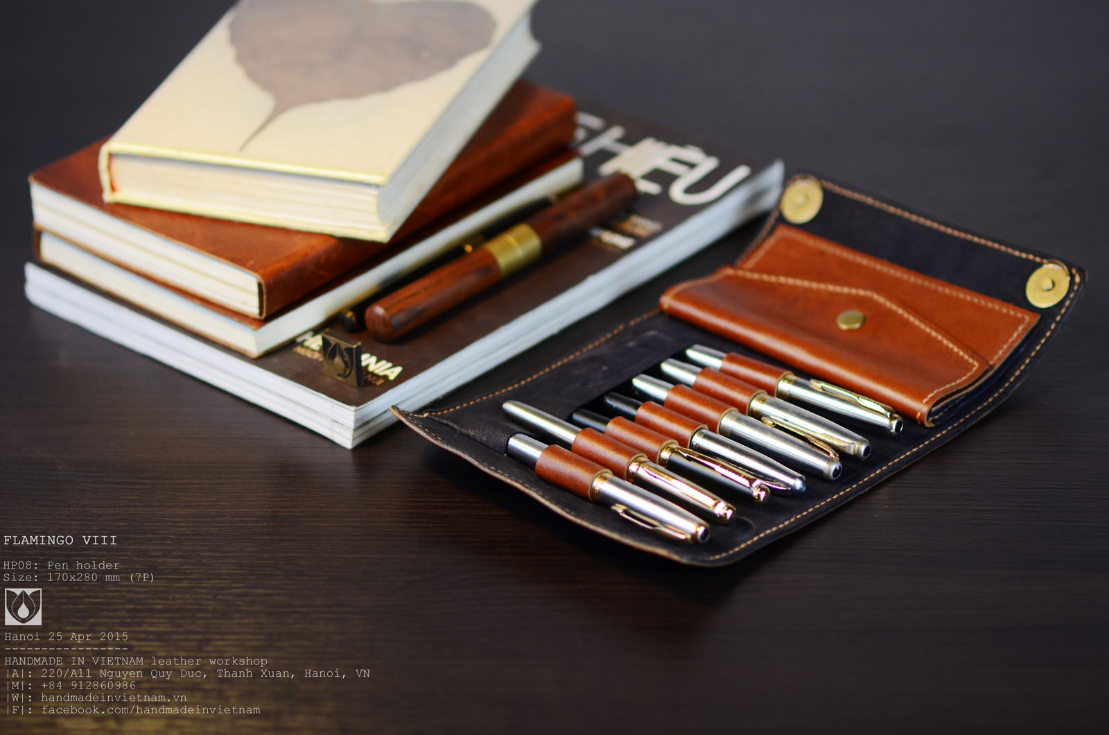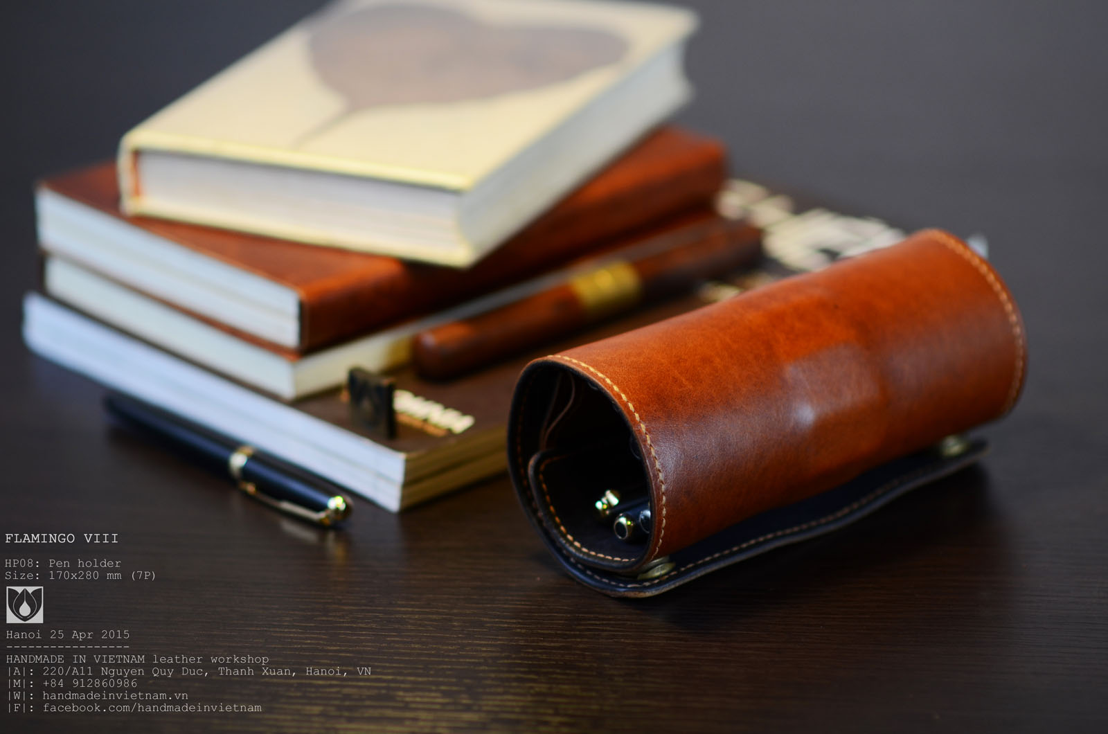 FLAMINGO HP08: Pen holder / Cuộn bút Size: 160x350 (5+5 Pens) Với mỗi sản phẩm chế tác thủ công, tôi đều đặt cho nó một cái tên một cách trân trọng và đầy yêu thương, tựa như những đứa trẻ mới chào đời, và rồi... chúng lại ra đi, tới những phương trời...